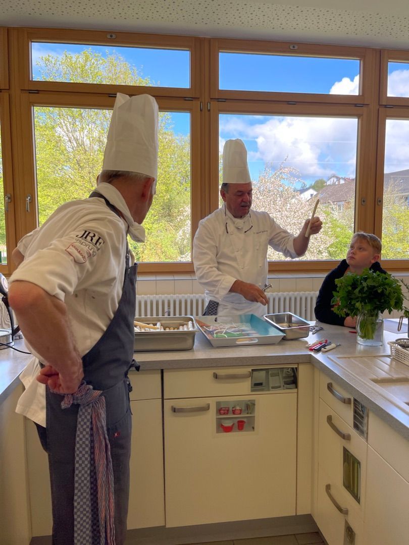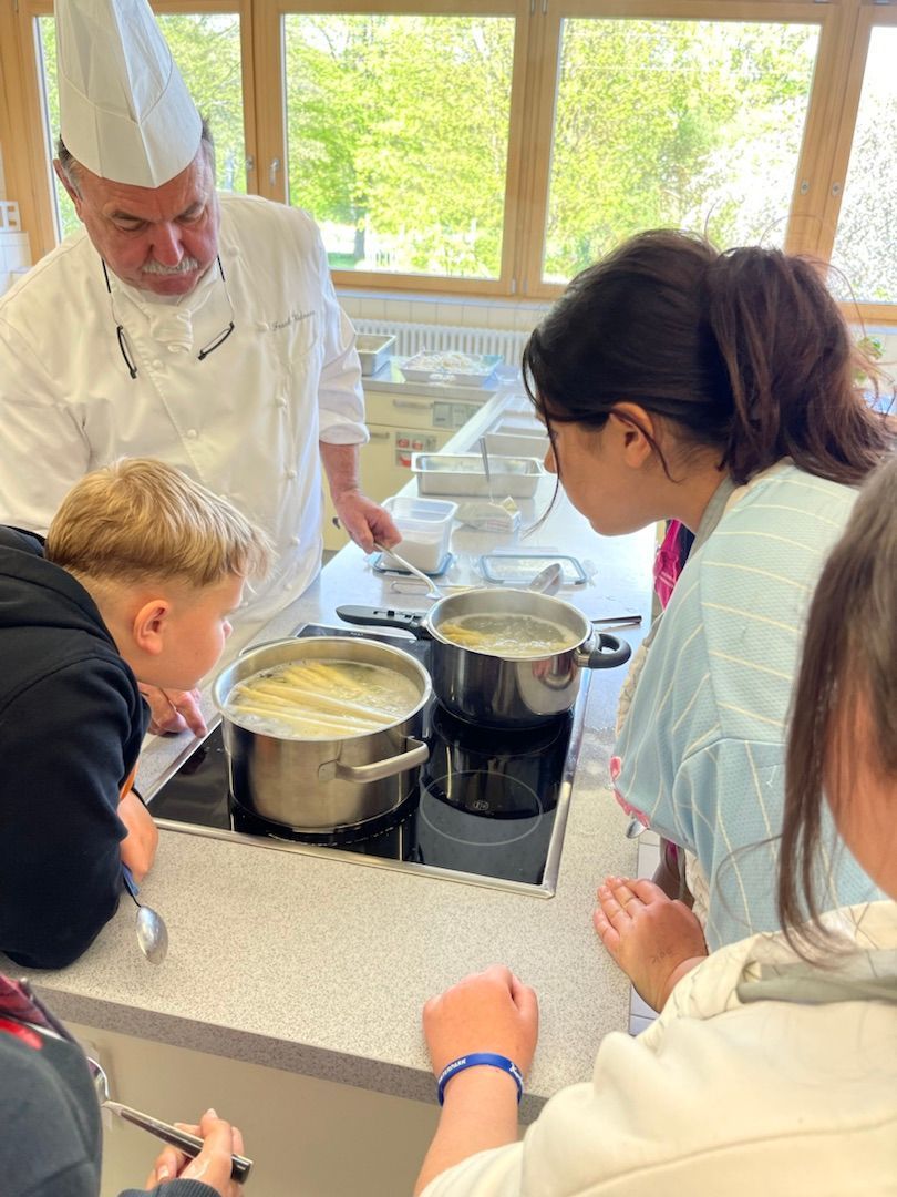 Am Donnerstag, 18.April war Herr Widmann bei uns an der Schule. Gemeinsam mit den Schülern der Schlemmerbande hat er in der Schulküche gekocht. Es gab Spargel mit Kräuterpfannkuchen. Alle hatten an diesem informativen Nachmittag viel Spaß beim Zubereiten der Speisen. Am Ende hat es allen geschmeckt. Herzlichen Dank an unsere Kooperationspartner Herrn Widmann und Herrn Blümle vom Löwen in Zang.